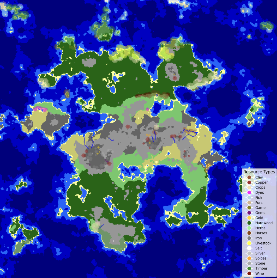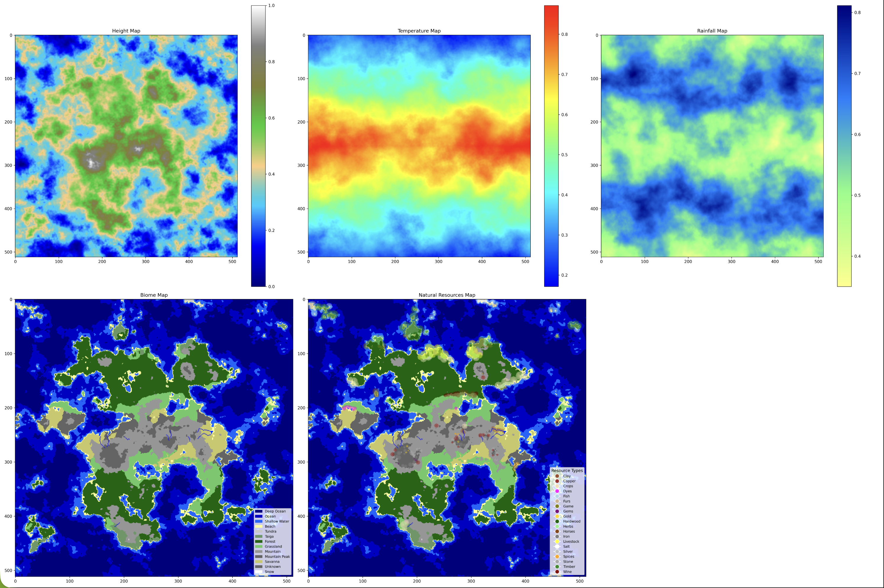 A Python-based procedural world generation system for top-down RPG games. It features realistic terrain generation using layered Perlin noise, climate systems with temperature and rainfall, erosion simulation, and society simulation including settlements and history.